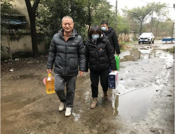 在夫妇二人均中风、家庭困难群众王书琴家里,物流公司总经理吴雯燕询问孩子有没有回家过年,了解夫妇二人身体情况和生活上的难处,为他送上了米、油等生活物资和新春的祝福,鼓励他树立信心、战胜困难,真正把关怀送到老百姓心里。